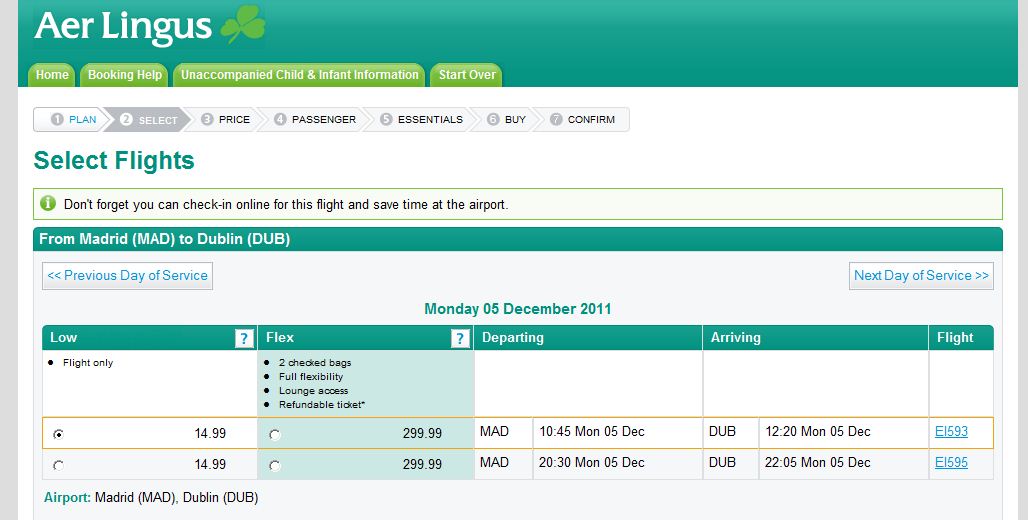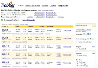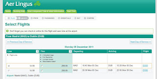 Pero hasta hace dos semanas no había tenido la oportunidad de viajar con AerLingus, la low cost irlandesa menos conocida. En mi caso era para un viaje a Dublín, por lo que en precio era, junto con Ryanair la opción más económica, como podéis ver: